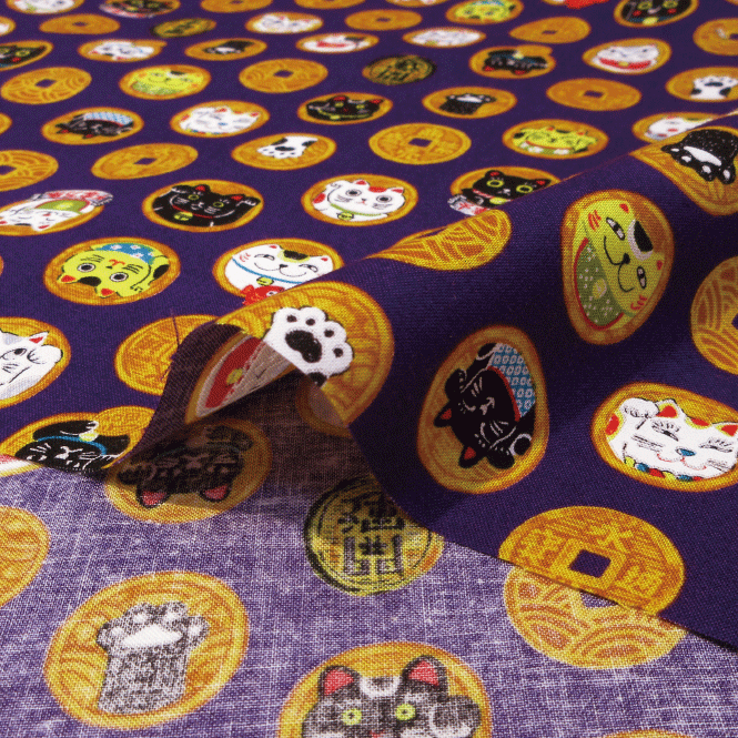 配送方法対応サイズ メール便個数1〜20 宅配便1個〜招き猫と小判の和調テイストのシーチング生地が入荷しました 落ち着いた紫色にそれぞれ個性的な招き猫たちが印象的で縁起が良さそう♪