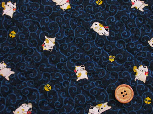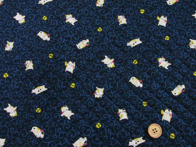〜ゆるかわ和柄〜 まったりまねきねこ・鈴・唐草模様 シーチング生地 (濃紺) 全針キルト (入園入学 レッスンバッグ シューズ入れ 座布団カバー ポーチ インテリア カバーリング 手作り 手芸 ハンドメイド)