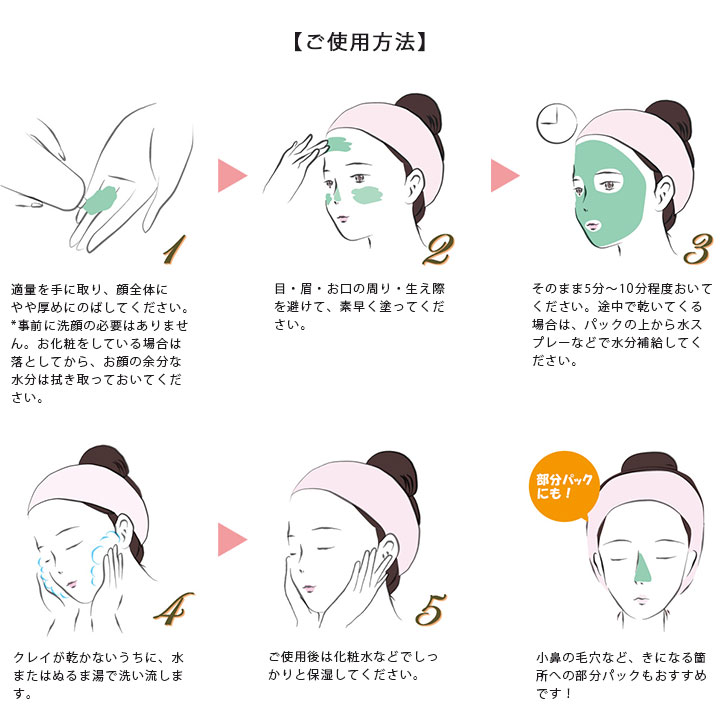 【ご使用方法】 顔、ボディなどに塗布し、クレイ表面が乾く前(約12〜13分後)に洗い流して下さい。