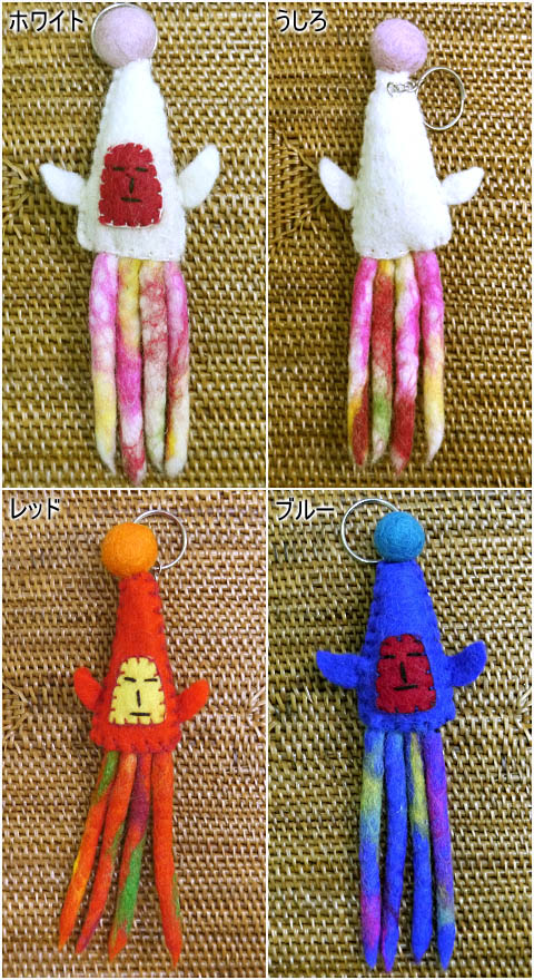 ネパールからやって来たシュールでキュートな手作りフェルトのイカさんキーホルダー/アジアン雑貨/エスニック(ポスト投函配送選択可能です/6個毎に送料1通分が掛かります)