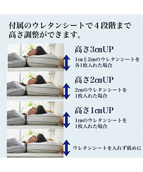 高さを4段階に調節可能!中身とカバーがそれぞれ分割できる構造で、マイクロファイバーわた入りの枕本体部分、高さを調節するウレタン層(1cm、2cmの各1枚)、カバーに分けられます。