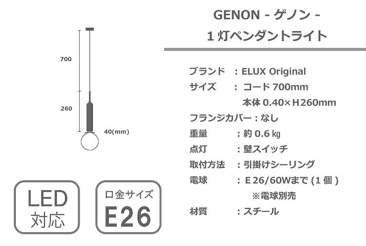 送料 下記地域以外1,430円(税込) ※東北・近畿・中国地方は1,650円(税込) ※北海道・九州地方は1,980円(税込) ※沖縄・離島は別途お見積り商品説明 サイズ コード700mm 全体:0.40×H260mm フランジカバー:なし 重量 約0.6kg 材質 スチール 点灯 壁スイッチ 取付方法 引掛シーリング 電球 E26/60Wまで(1個) ※電球別売 注意点 ・メーカー直送商品の為、ページ上で在庫ありの場合でも、ご注文後に欠品となる場合がございます。