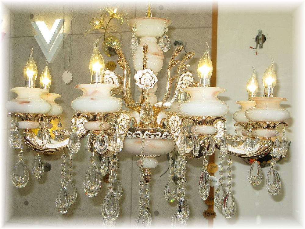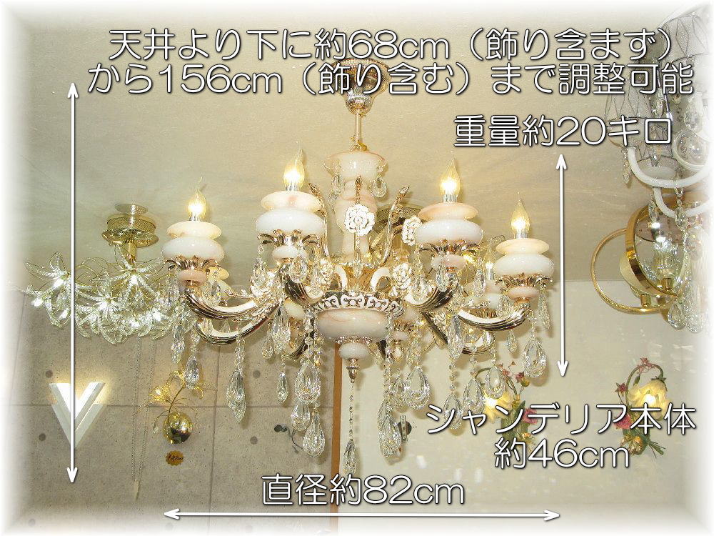 キャンドル8灯 超豪華 大理石調デザインガラス クリスタルシャンデリアを是非この機会に! サイズ サイズ・シャンデリア本体高さ46cm 直径約82cm 天井より下に最短約68cm(飾り部分除外)から吊り下げ最長約156cm(飾り部分含む)まで調整可能 重量約20キロです 156cm以上ご希望の場合はご注文後ご連絡お願い致します 送料 ■送料無料(沖縄・北海道別途¥1300-) ご注意 新品・未使用品での販売ですが製造上での多少の小傷等はご了承願います 取り付けに関しましては重量約20キロ引掛けシーリング対応不可で、取り付け説明を参考に組み立て・結線して下さい、ご心配の場合は安全を期して最寄の電気工事店にご依頼をお勧めいたします また取り付け方等事前にお知りになりたい方はお気軽に質問コーナー又はfirst@sannet.ne.jpにお問い合わせお願い致します 調光が必要の場合、調光対応LED1個別途¥200-と汎用調光器(Panasonic製LED用調光器推奨)が必要です 店頭販売もしており重複した場合キャンセルさせていただく場合がございますがあらかじめご了承願いますキャンドル8灯大理石調クリスタルシャンデリア ☆