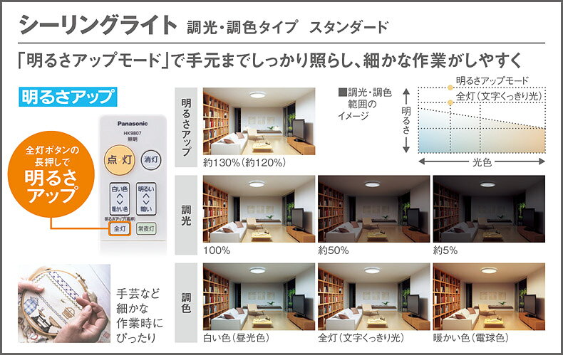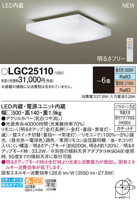 商 品 詳 細商品名インテリア 屋内 照明メーカー名パナソニック Panasonicメーカー器具名称シーリングライト(天井照明)仕様光源◆LED(昼光色6500K・Ra83/電球色2700K・Ra83)◆色温度:6500 K◆光源寿命40000時間(光束維持率70%)寸法・質量◆幅:□500 mm◆高:140 mm◆質量:1.9 kg仕様・注意事項LED照明の安心品質◆器具光束:3550 lm◆電圧:100 V◆消費電力:27.6 W◆消費効率:128.6 lm/W◆畳数:〜6畳◆デザイン分類:Casual◆【アクリルカバー】乳白つや消し◆昼光色Ra83◆電球色Ra83◆リモコン(〈明るさアップ(全灯長押)〉・全灯・普段・常夜灯・滅)◆壁スイッチ切替(普段←→常夜灯)◆リモコンで〈100%〜5%〉調光、〈昼光色〜電球色〉調色◆専用リモコン送信器同梱◆虫・ホコリの入りにくい構造◆明るさアップモード(約6200K、明るさ約120%)◆明るさアップモード時:33.2W◆※別売の傾斜天井アダプタ(HK9049)使用時、55度までの傾斜天井に取付可能◆入力電流(100V時):0.29 A◆明るさアップモード時は全灯時より光束と消費電力が増加し、固有エネルギー消費効率が低下します。