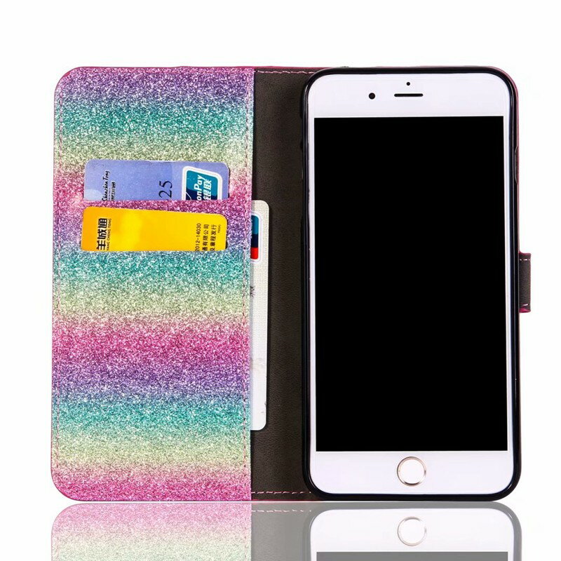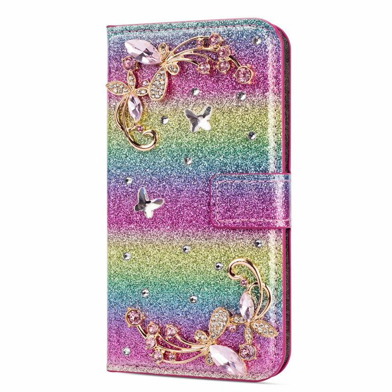 iPhone SE3 (2022) / iPhone SE2 (2020) / iPhone7 / iPhone8 対応 スマホケース 手帳型 ビジュー ラメ 蝶々 かわいい キラキラ デコ ラインストーン グリッター レインボー マグネット開閉 カード収納 スタンド機能